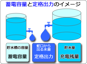 貯水槽に例えると、水の入る量に相当し、この数値が大きいほど大量の電気を蓄えることができます。